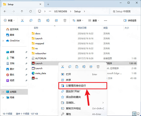 7、打开安装包解压后的【UG NX2406(64bit)】文件夹,打开【Setup】文件夹选择【Launch】【以管理员身份运行】