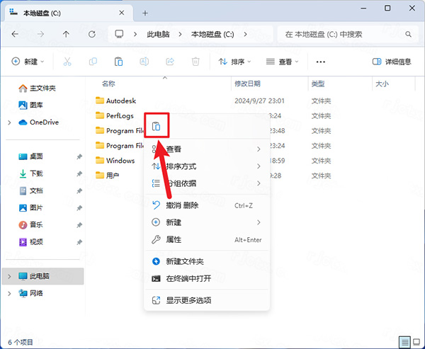 6、打开电脑C盘,鼠标右击空白处选择【粘贴】