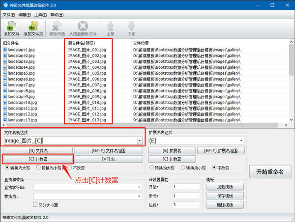 首先在文件名表达式中添加下划线分割,变为“image_图片_”,然后在“文件名表达式”区域中找到“[C]计数器”,点击之后,可以看到文件名表达式变成了“image_图片_[C]”,此时可以看到新文件名变成了“IMAGE_图片_001.jpg”等按顺序递增的形式,如下图所示: