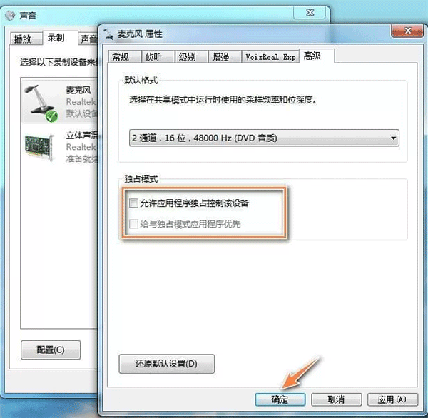 第三步:接着选择“高级”选项,并取消勾选“允许应用程序独占控制该设备”, 然后点击“确定”。
