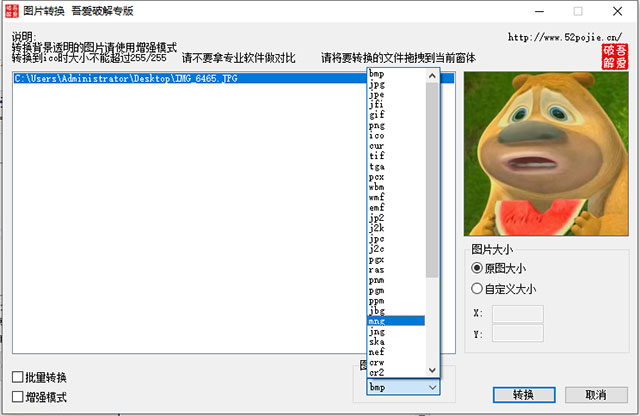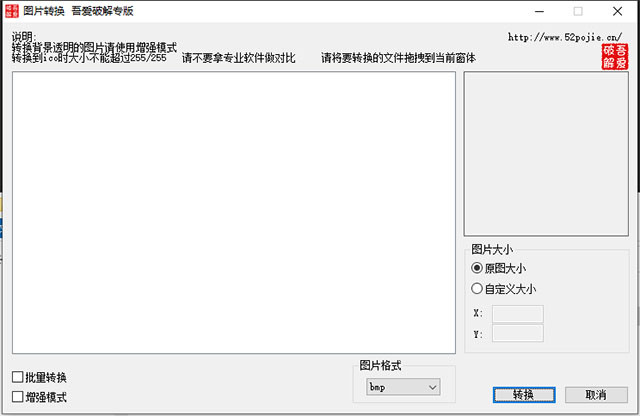 吾爱图片转换器是一款绿色小巧,功能实用的简单的图片转换软件,该软件完全免费,拥有批量转换和增强模式两种转换方式,能够将图片转换为bmo、JPEG、PNG、TIF、GIF、PSD、ICO等多种图片格式,并支持自定义大小,是你转换图片的好帮手。最重要的是,这款软件所占的内存非常小,而且使用简单,点击即可进行转换,无需安装,非常的方便快捷,有需要的朋友快来下载体验吧!!!