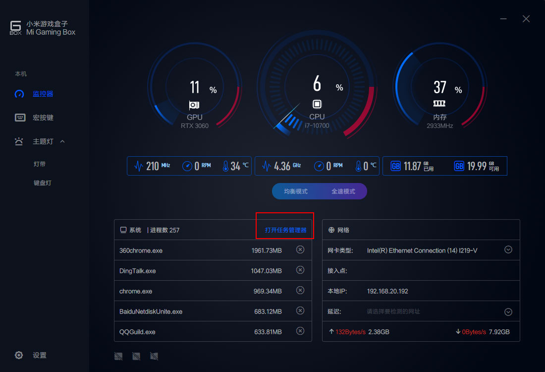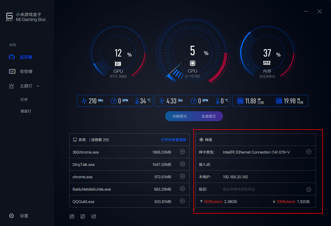 通过这个区域,您可以及时监测到网速、网络流量、以及网络延迟等信息。