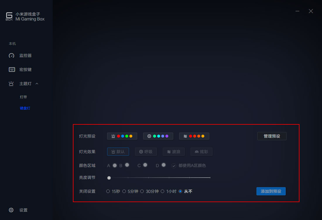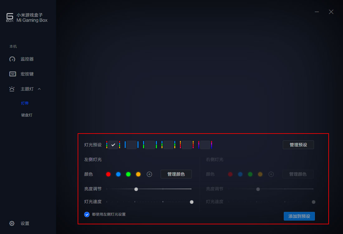 您可以选择我们为您预设的灯光效果,也可以自行设置氛围灯的亮度、呼吸速度等,以获得您喜爱的灯光效果。