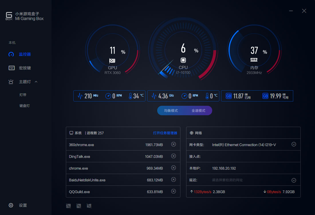 通过清晰的仪表盘,您可以看到笔记本GPU、CPU、内存的使用情况与运行情况,一目了然。