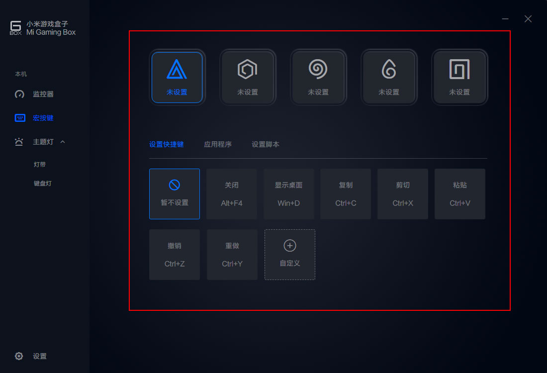 在这里,您可以针对小米游戏本键盘左侧的5个宏按键进行设置,定义您希望用到的功能。设置的范围包含快捷键、应用程序、脚本,当您绑定按键后,您点击对应的实体按键,程序将为您执行对应的操作。如果您不不希望绑定按键,可以选择暂不不设置。