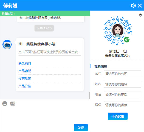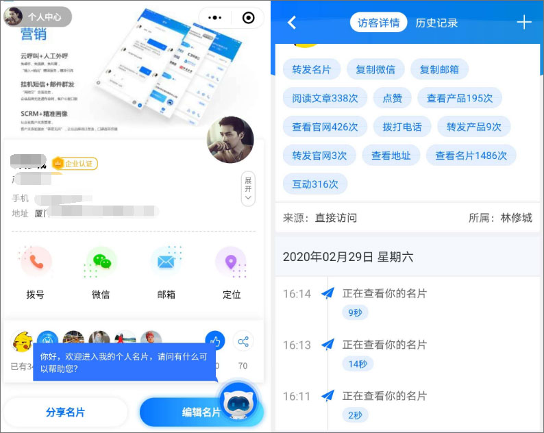 微信小程序+智能AI客服,连接10亿微信用户,把个人,公司、业务,以及官网全部展示出来,齐全的商城功能(购物车、营销活动、在线支付、物流记录),文章朋友圈裂变拓粉获客,微信智能客服时时在线咨询。实时监控来访客户动态,访客信息同步客户管理系统中再次进行营销。