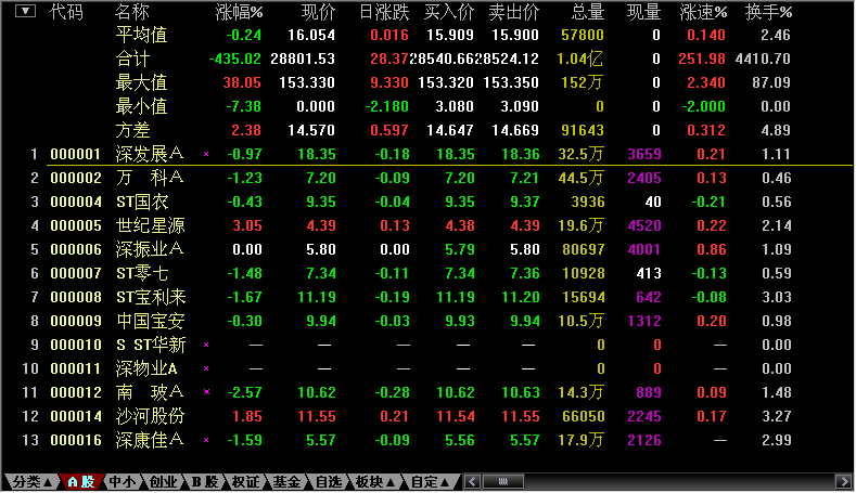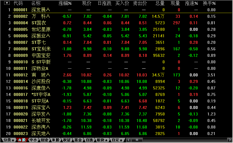 敲数字81、82、83、84、85、86、87,可分别调出上海A、B股,深圳A、B股,沪债、深债,深沪A股的综合排名。系统用9个排成方阵的小窗列出所选市场的股票的涨幅、跌幅、振幅、5分钟涨幅、5分钟跌幅、量比、委比、成交金额排名。