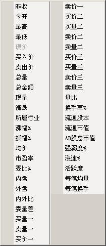 要想更换某一栏的内容,请用鼠标右键点击其栏目名称,然后从弹出菜单上选择新栏目。例,右键点击『现价』栏,弹出菜单后,找到『市盈率』,左键点击它,则该栏目内容换成市盈率。