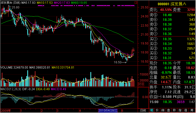 您所看到的组合窗口下的分析图分成左右两部分:右边信息栏显示股票交易信息。左边有三个图,最上面为主图,显示的是K线,并叠加有收市价的5日、10日、20日、60日均线(分别为MA1、MA2、MA3、MA4),标在主图的左上角,字体颜色与指标画线颜色相同。下面两个是副图,分别为成交量走势(上面叠加有5日、10日均线)和指标线。注意,最下面的副图的纵坐标区域边框加粗,表示它是当前活动的副图(试一试点击另一个副图的纵坐标区域,可使它变为活动的)。
