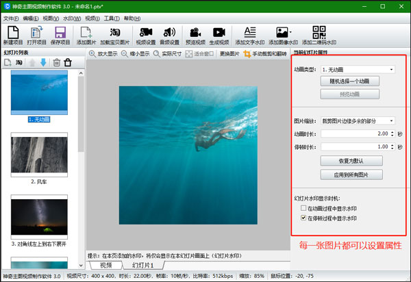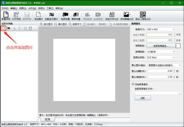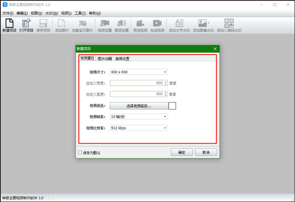 2、新建项目,设置视频属性,包括视频尺寸、视频底色、视频帧率、视频比特率;设置图片动画;添加背景音乐,点击确定即可创建一个新的视频项目,创建成功后软件界面如下图: