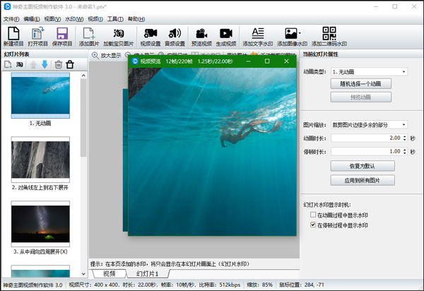3、每一张图片的属性设置完成后,点击“预览视频”按钮,查看制作好的视频,如下图: