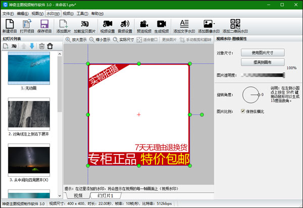 神奇主图视频制作软件是一款功能强大,且专为淘宝、1688、京东等电商用户研发的网店产品主图视频制作软件,不但提供了多达90多种的图片动画显示效果,还有着照片编辑和裁剪功能,再搭配上音乐、文字、水印等元素,可为用户轻松生成导购产品的展示视频,并且还可以给视频添加多种水印,如:文字、图标、二维码等等,每种水印都能够进行属性微调设置。此外,软件还采用了高清视频编码引擎,可支持从400x400到1080x1440等多种分辨率的视频输出,是每位网店店主制作主图视频的必备工具。