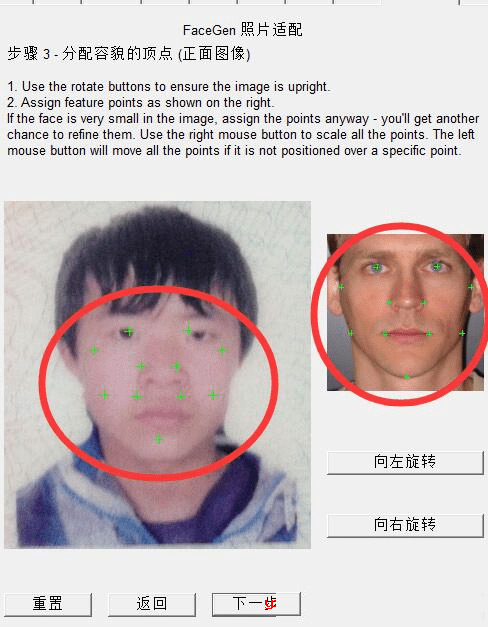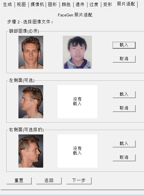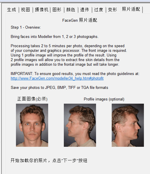 2、如果是制作指定人物的头部模型,那么就需要他的照片了。点击下一步,软件中需要导入三张图片,正面照,左侧照和右侧照,请按软件提示的方位拍即可,像素尽可能高,光线尽可能好,注意要露出额头,否则做出来后头部留有黑色的头发痕迹就不好了,不过也可以修改,傻瓜模式的教程就不介绍了。