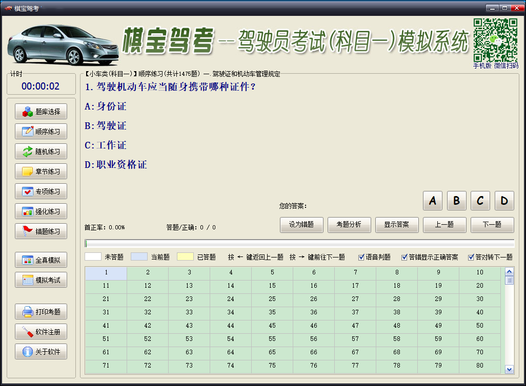 未注册只能看顺序练习的前80题,已付费注册版本没有任何功能限制,可以练习所有题目和使用软件中所有功能。