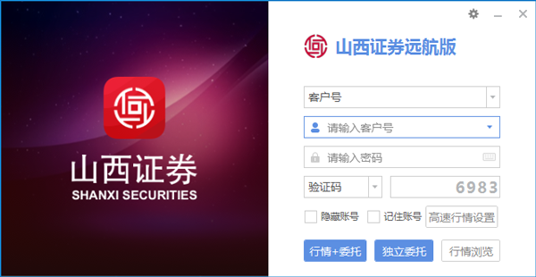 用户在电脑上安装成功后即可打开如下界面,如果用户需要交易可以输入在山西证券开户的资金账号(即:客户号)后点击【行情+委托】或【独立委托】,委托登录交易一般只针对于散户