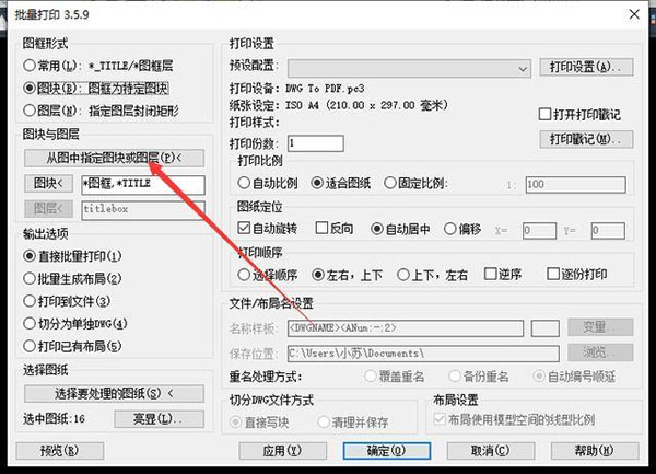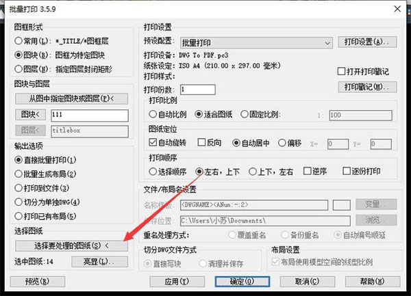 8、点击【应用】,然后【选择要处理的图纸】按键到CAD窗口去选取图纸,把需要打印的图纸全部框选;