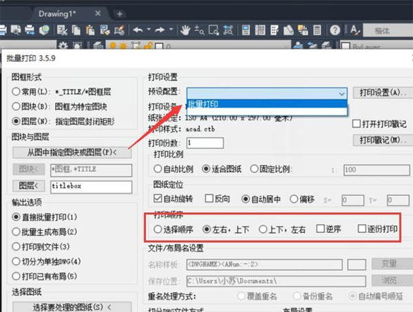 7、如图在【预设配置】下拉菜单中选择刚才设置好的打印样式名称;然后设置好如下图位置,其中【打印顺序】可以按照个人喜好设置;