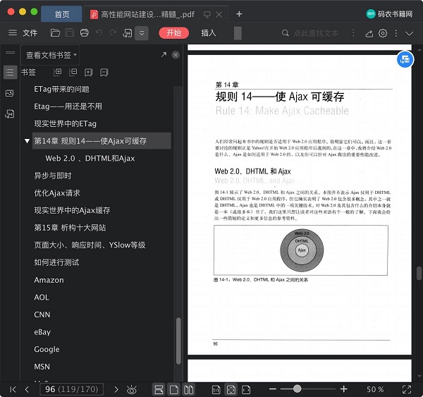《高性能网站建设指南:前端工程师技能精髓》内容丰富,主要包括减少HTTP请求、Edge Computing技术、Expires Header技术、gzip组件、CSS和JavaScript很好实践、主页内联、Domain最小化、JavaScript优化、避免重定向的技巧、删除重复JavaScript的技巧、关闭ETags的技巧、Ajax缓存技术和最小化技术等。