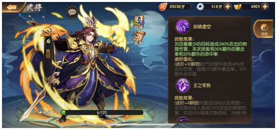 2、这游戏分S、SS、SS+SSS武将,如果你抽到S武将先不要分解,因为这个游戏讲求情缘,S级武将基本都是触发情缘,SS武将这个要说一下。很多玩家花了大量精力和资源去养SS级,目前来说的SS级,就是蜀国庞统、吴国陆逊、魏国郭嘉、群雄于吉、这四个值得培养,千万不要抽到一些你觉得他很厉害的武将就疯狂去养他。