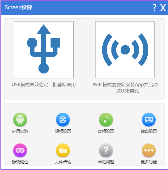 2、现在用USB线连接手机和电脑,启动Screen投屏,点击主界面上的USB图标,第一次使用会提示你打开USB模式。