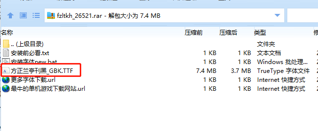 ①在本站下载完成后,会有一个压缩包,打开点击【方正兰亭刊黑_GBK.TTF】