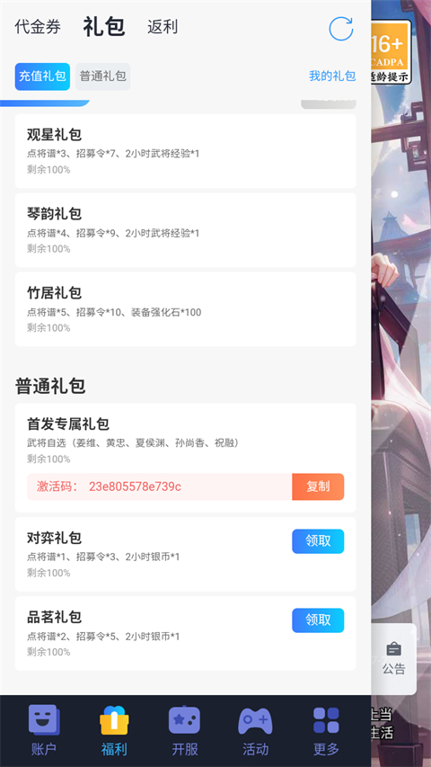 1、登录游戏后,点击首页悬浮球,领取福利礼包兑换码