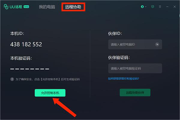 1、打开uu远程控制电脑版,被控设备点在“远程协助”界面选择下方“允许控制本机”选项,