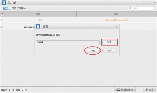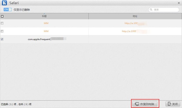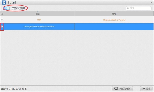 第三步:扫描成功之后,将跳转到Safari记录结果列表。点击左上角【仅显示已删除】,橙色字体即为扫描到的已删除数据。并勾选想要恢复的数据(否则默认为全选)进行恢复操作。