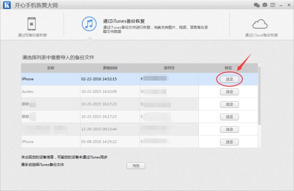 第一步:打开开心手机恢复大师,点击顶端的【通过iTunes备份恢复】,选择您需要恢复的iTunes备份文件,点击【选定】按钮,直接进入扫描iTunes备份恢复模式。