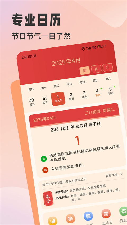2、老黄历相关:每日吉凶宜忌,节气时令,天干地支,知晓传统历法文化