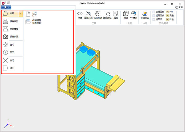 4、文件包括打开(打开和样例模型)、保存模型、另存模型、保存快照、选项、关于、关闭、退出,如图所示;