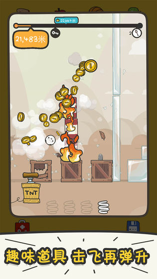 游戏本身应该就是一个简单的休闲游戏玩家控制香蕉飞多远,这个根据当前的序列长度来决定,只要条数打满你在红线里面点击就会弹的,最远的,但是注意这个时候是蓄力蓄得最远。王家想要台上的更远,还要借助一个旋转力,皇家再弹到地面的时候,你渲染的速度越快,那么在地面上就会弹出更远的距离。其次就是这个游戏中的金币玩家有看情况获得,因为这个金币他你直接从天空中拿到那些金币是非常少的,所以说不要贪那么几个金币来忽略了玩家的心记录,以及场景中地面上的一些金币袋子。