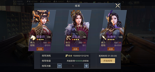 练军在玩家主公府达到7级之后开启,玩家们通过消耗粮草为武将练级。每消耗15万粮草可以为武将提高10万经验。