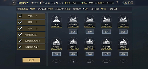 领地是用来统计目前为止你所占领的资源的数量,位置以及资源等级的,并且大家可以直接通过领地界面放弃低等级资源,跳转到某个指定哨塔,要塞等等。