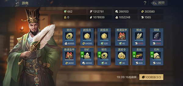 游商内的商品每24小时自然刷新一次,目前游商有三种兑换方法,第一种是资源(包含铜币)兑换资源,第二种是珠玉兑换资源,第三种是战功兑换。