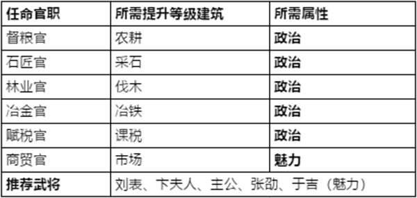 玩家通过任命武将来提高各种资源的产量。目前可任命的职位是大司农、督粮关、石匠官,赋税官以及商贸官。其中除了商贸官看的是武将的魅力值之外,剩下的都看的是政治点。另外,粮食,石料,铁矿以及林业这些官员的任命需要城内相应建筑达到10级。