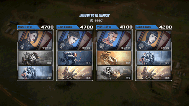 第一回合开始时,双方都有四个初始开局可以选择,但是这个初始开局双方是不一样的。初始开局包含一个专家,两队t2,三队t1,并且解锁对应的单位。(t2是指用50块钱解锁200购买的单位,t1是指0解锁费100购买的单位,t3专指200解锁400购买的巨型单位)同时每个初始专家的血量是不一样的。