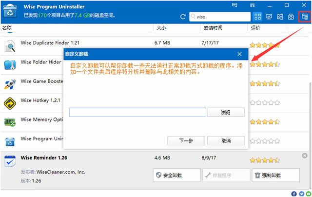 Wise Program Uninstaller 还提供2中特殊的卸载方式,强制卸载和自定义卸载。