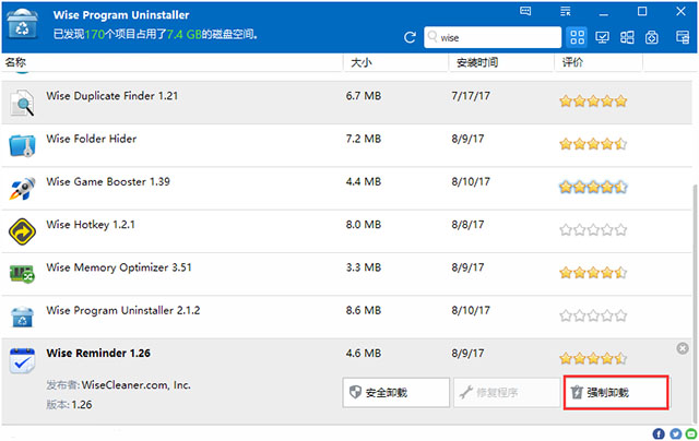强制卸载:当 Wise Program Uninstaller 列出来的某个程序无法通过安全卸载移除时,我们建议你使用 Windows 控制面板中的“卸载程序“尝试卸载。如果也无法卸载该程序,可以使用 Wise Program Uninstaller 的”强制卸载“功能。