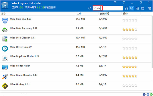 Wise Program Uninstaller 默认用程序的首字母递增的方式对应用程序排序,你可以通过鼠标滚轮向下滚动查找程序,也可以在搜索框中输入程序名字快速定位。也可以按安装时间排序,卸载那些早期安装的但是没有使用的程序,还可以按大小排序,卸载那些体积超大的程序,释放更多磁盘空间。