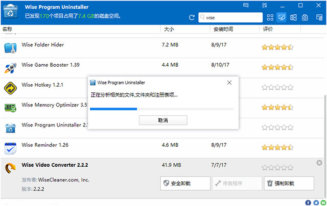 7、带有安全卸载和强制卸载两种功能。前者会尽可能的调用软件自带的卸载程序,使用这种方式是最稳定和安全的。而后者则会使用Wise Program Uninstaller自带的算法分析和软件有关系的注册表和文件。
