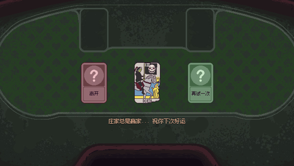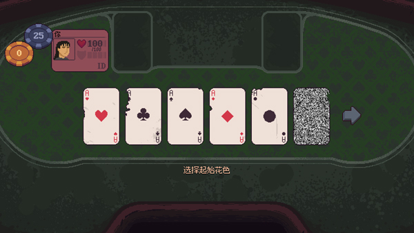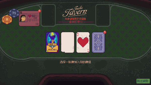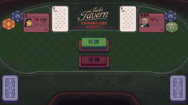 4、玩家需与NPC进行比赛,通过叫牌来抓取扑克牌,最接近21点的玩家则获胜,超过21点则自动爆牌输掉比赛,对手爆牌则攻击对手与自己卡牌点数相同的血量,双方均无爆牌则以差值攻击输掉的玩家;