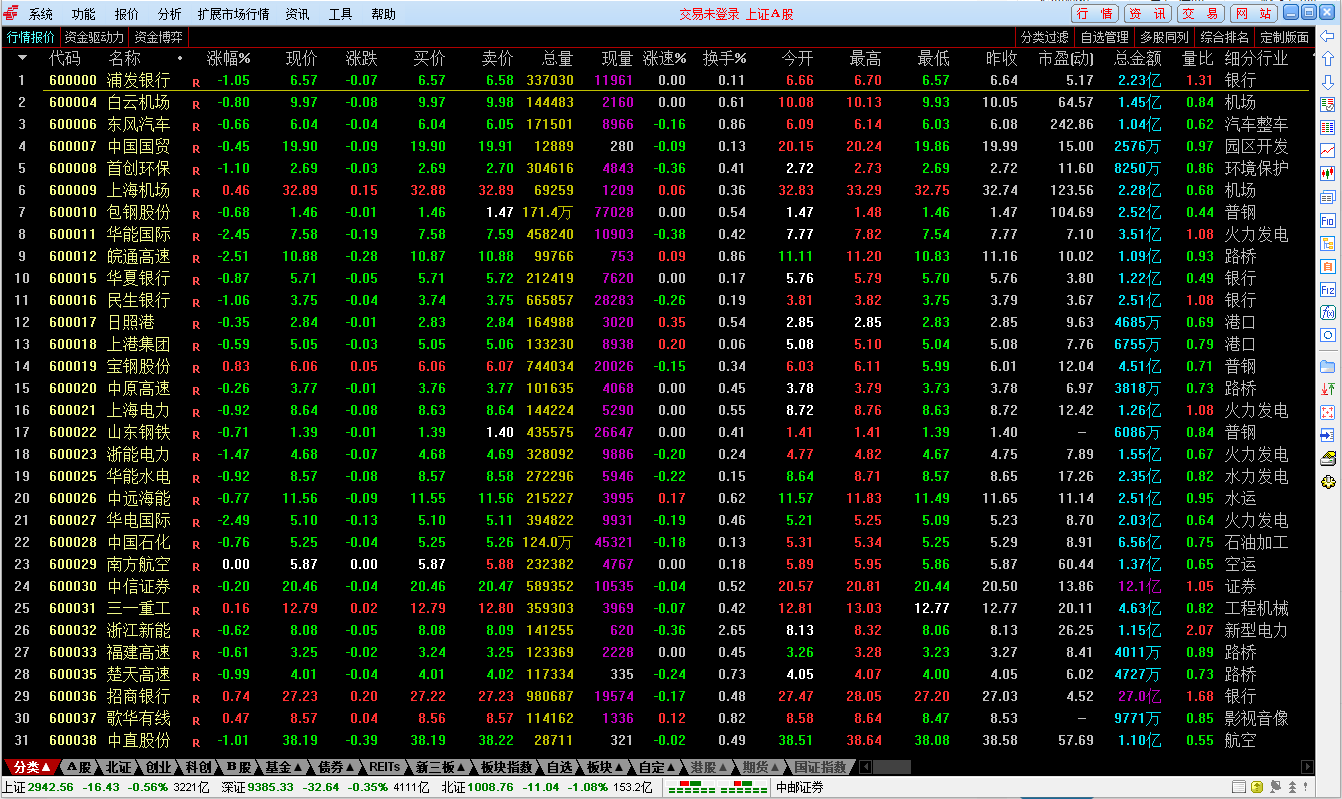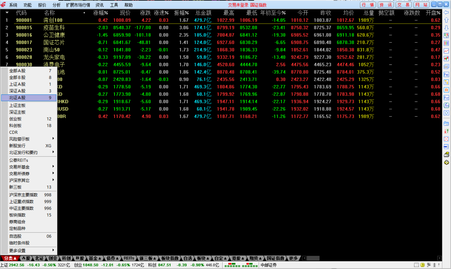 3、左下角的分类选项包括所以的股市分类,有A股,中小,创业,债券等分类,根据需求选择相应的类型即可,