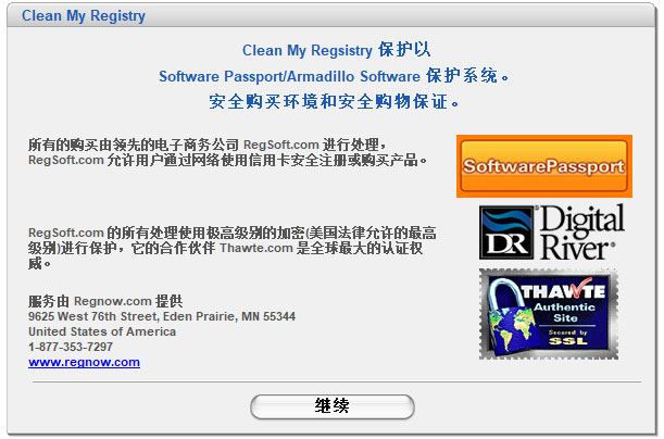 1、首先,我们运行Clean My Registry,进入Clean My Registry荣誉窗口,用户可以勾选【不要再显示此窗口】,下次运行时将直接进入软件不会再出现此窗口,然后点击【继续】。