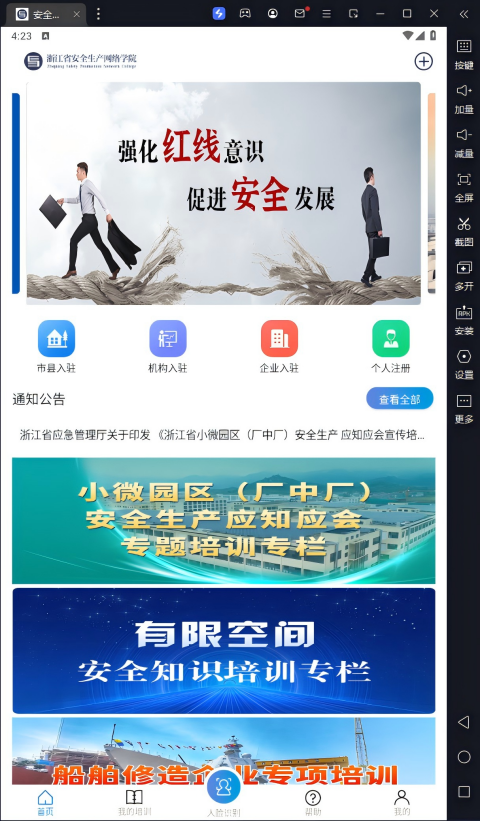 安全学院电脑版是一款基于安卓模拟器运行的在线学习软件,它主要用于提升在职员工的安全技能,是非常便利的软件。在这款软件内进行学习,不用占用时间线下培训,只需要利用碎片化的时间就能随时随地看课,它支持市县单位、培训机构、企业、个人等入驻,而且多平台数据同步,手机和电脑上的学习进度完全互通。它的课程丰富,高压电工作取证培训、船舶修造企业专项培训、政务培训、应急行政执法专业知识培训、高空作业取证培训、电气焊作业培训等等,让你使学习更便捷,手段更加多样。