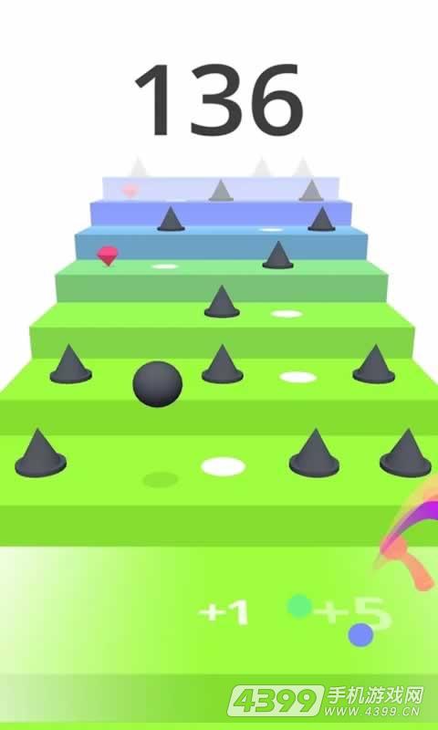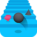 游戏操作很简单,就是滑动屏幕,然后左右控制小球跳跃的方向,游戏里面的场景是台阶,一级一级的。玩家可以根据自己的游戏操作手感来控制游戏。途中会有很多尖刺,我们需要小心避开各种尖刺,因为跳到上面就炸了!