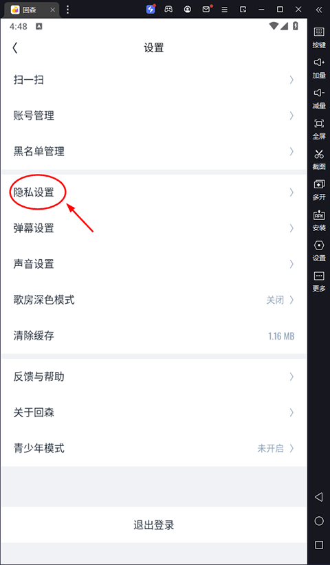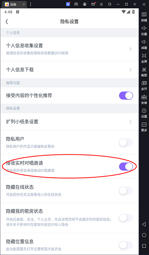 关于怎么开接收实时对唱邀请,操作挺简单的:先在安卓模拟器里打开回森,点右下角“我的”,再戳右上角设置图标,接着找“隐私设置”,最后把“接收实时对唱邀请”那按钮打开就行。这样就能随时接收到别人的对唱邀请,一起玩更带劲。