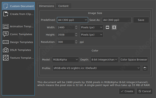 4、点击左栏的 新建自定义文档 ,在 尺寸 选项卡的 预设 下拉菜单选择 A4 (300ppi) 或者其他所需尺寸。
