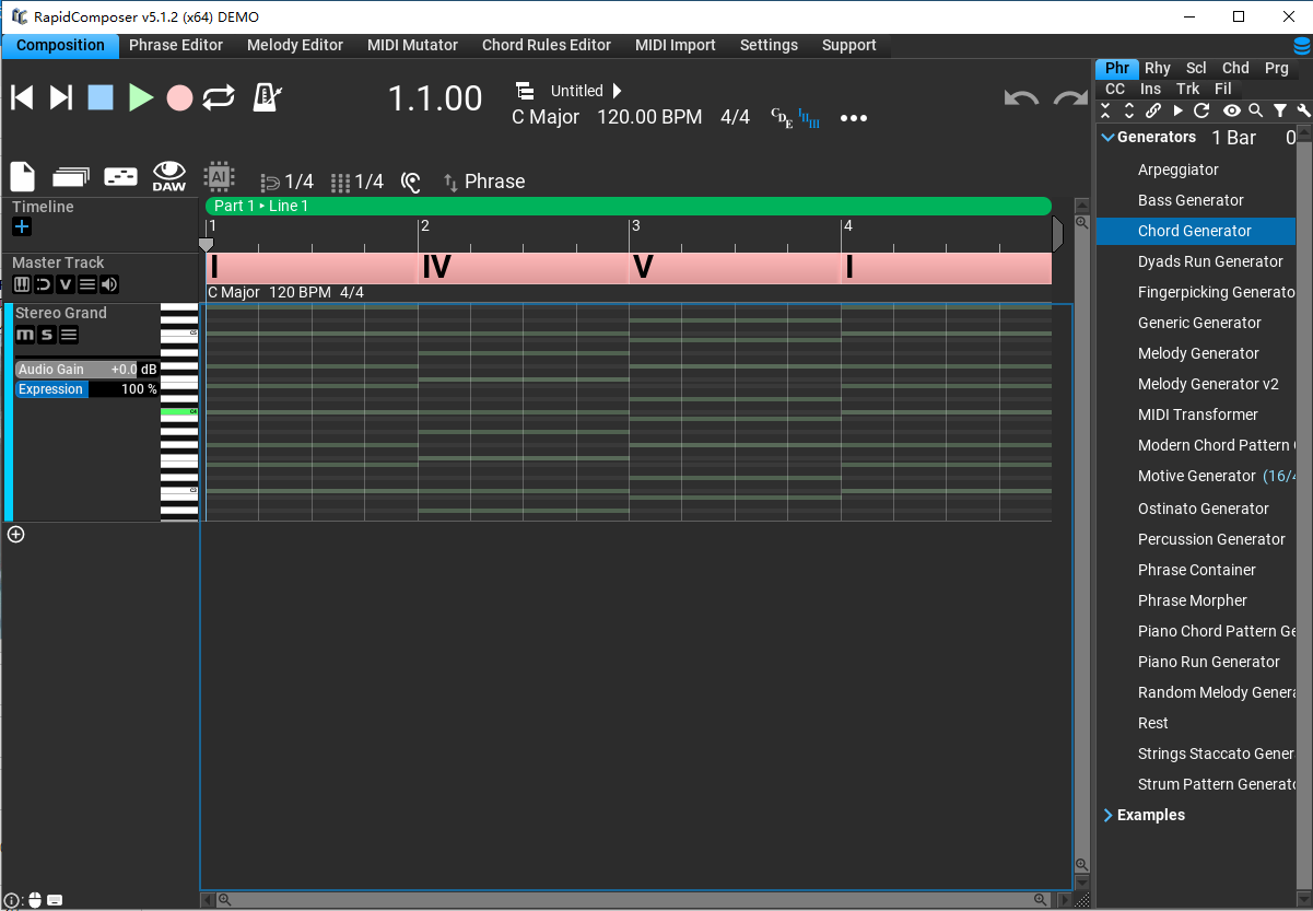 6、包括的乐句生成器:琶音器,低音生成器,和弦生成器,Dyads Run,生成器,Fingerpicking生成器,Generic生成器,乐句容器,Piano Run生成器,Strings Staccato生成器,Piano Chord Pattern生成器,Strum Pattern生成器,仅在完整版中:Melody发生器,随机旋律发生器,短语变体