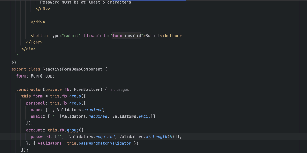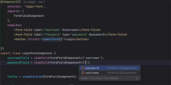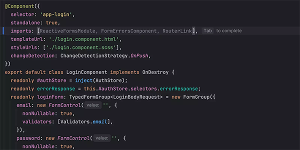 WebStorm 现在为 Angular 的反应式表单中的 FormGroup、FormArray、FormControl 和 FormBuilder 提供代码补全和生成支持。 此更新使表单结构更易定义和管理,有助于减少手动工作量并提高开发速度。 借助更好的自动补全和快速修复,反应式表单的处理现在更加直观高效。